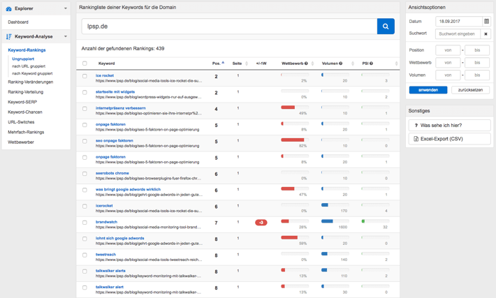 Unter Ranking-Veränderungen können Sie sich anschauen, wie sich die Position des Keyword zwischen zwei zeitlichen Messpunkten verändert hat.