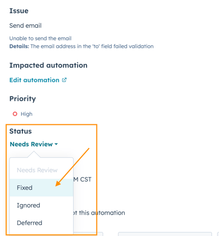 Beim Überprüfen eines Workflow-Problems zeigt HubSpot den entsprechenden Überprüfungsbildschirm an, auf dem Sie aus den Status Behoben, Ignoriert oder Verschoben wählen können.